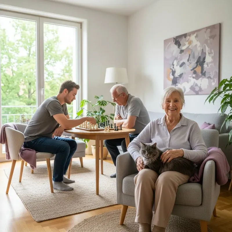 In unserer ambulant betreuten Pflege‑WG leben Seniorinnen und Senioren selbstbestimmt in Einzelzimmern, teilen Küche und Wohnbereich und erleben echten Alltag: gemeinsam kochen, spazieren, spielen, sprechen. Als Präsenzkraft wohne ich vor Ort und koordiniere die ambulante Pflege. So verbinden wir Sicherheit, Nähe und Lebensfreude, mitten in Berlin‑Neukölln.